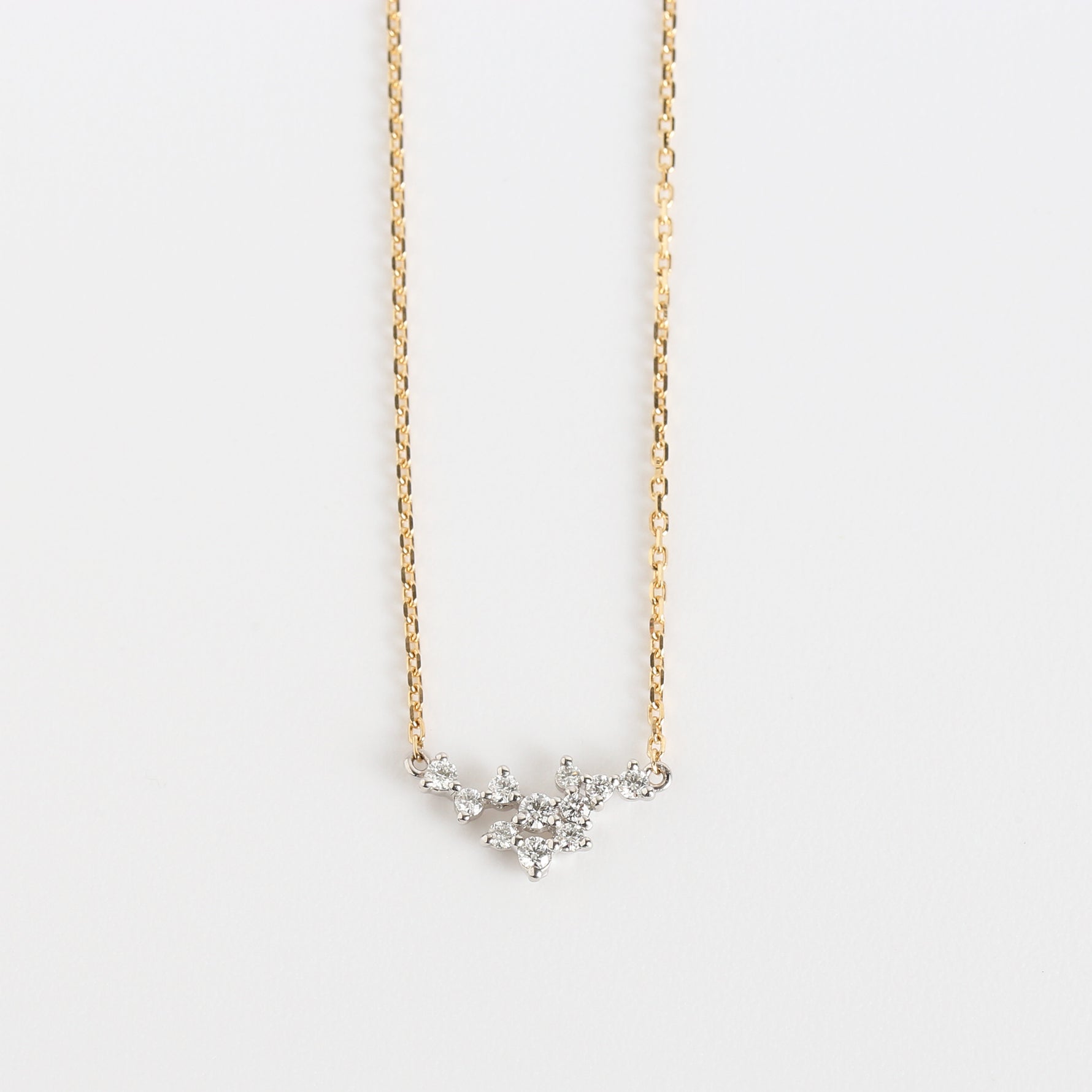 プラチナとK18ゴールドの上質な2種類の材質を組み合わせたコンビカラー仕様。繊細に連なるダイヤモンドは降り落ちた雨粒を表現しています。チェーンはトップを引き立たせる度詰めのカットアズキ型チェーンを使用。太陽の光を受けキラキラと光る水滴のような輝きでデコルテラインを綺麗に映し 出します。洗練されたミニマムなデザイン、繊細で上質なダイヤモンドの輝きをお楽しみいただけるネックレスです。