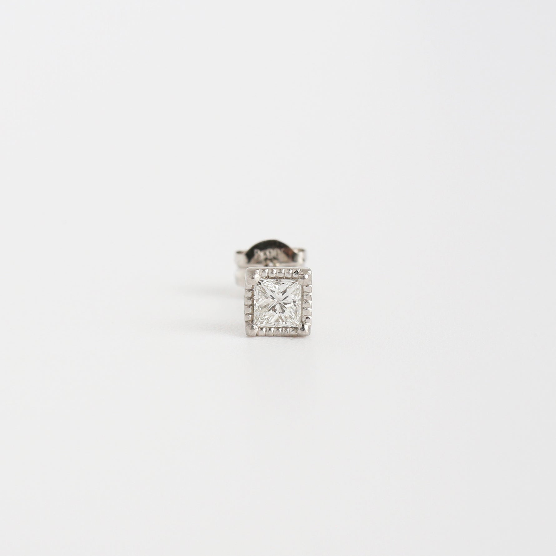 気品ある華やかなプリンセスカットのダイヤモンドをセレクトしたスタッドピアス。ダイヤモンドを取り囲むPt900の地金に手仕事で一刻一刻と、細やかなミルグレインを施した優美なデザイン。タイムレスかつ洗練されたシルエットと個性豊かなダイヤモンドの輝きで、身に着ける人の耳元を華やかに彩ります。