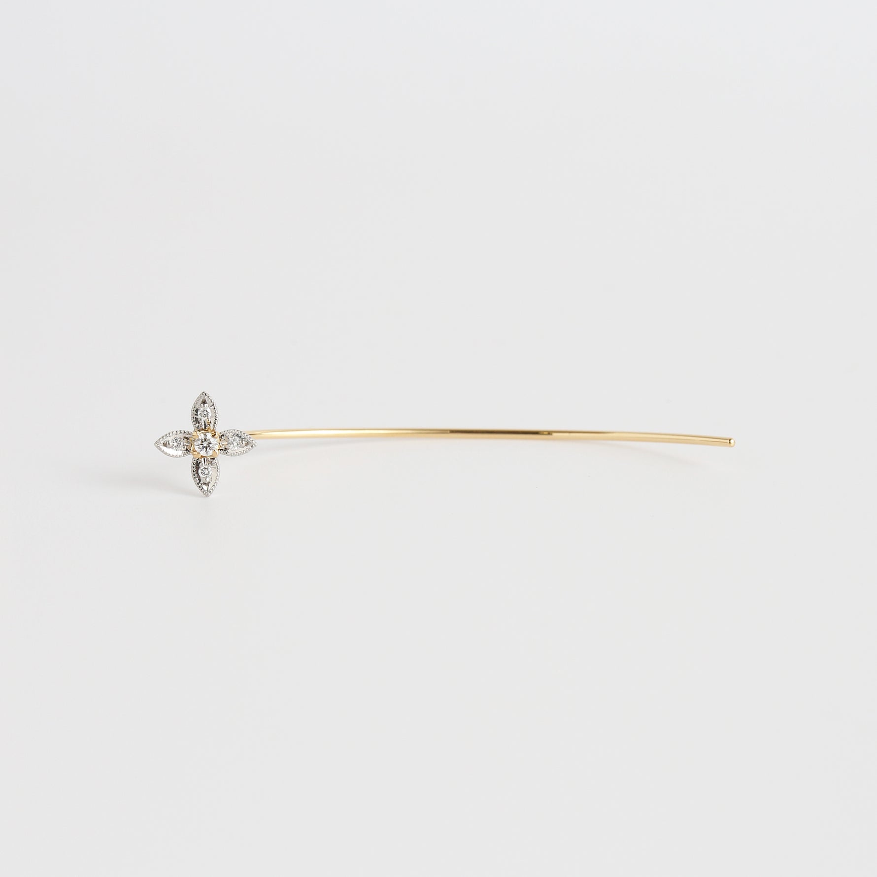 雛草をイメージした一輪の花ピアス。花の茎に見立てたカーヴィなゴールドバーの先に咲いた雛草の花。花の中心で煌めく上質なダイヤモンド、力強く真っすぐと伸びた4枚の花びら、凛とした花びら1枚1枚にメレダイヤモンドをあしらい、縁にはミルグレインを施して繊細かつ華やかに仕立てました。横からも後ろからも魅せる、可憐さだけではなくコントラストを効かせた質感とディテールにこだわった一輪の花ジュエリー。