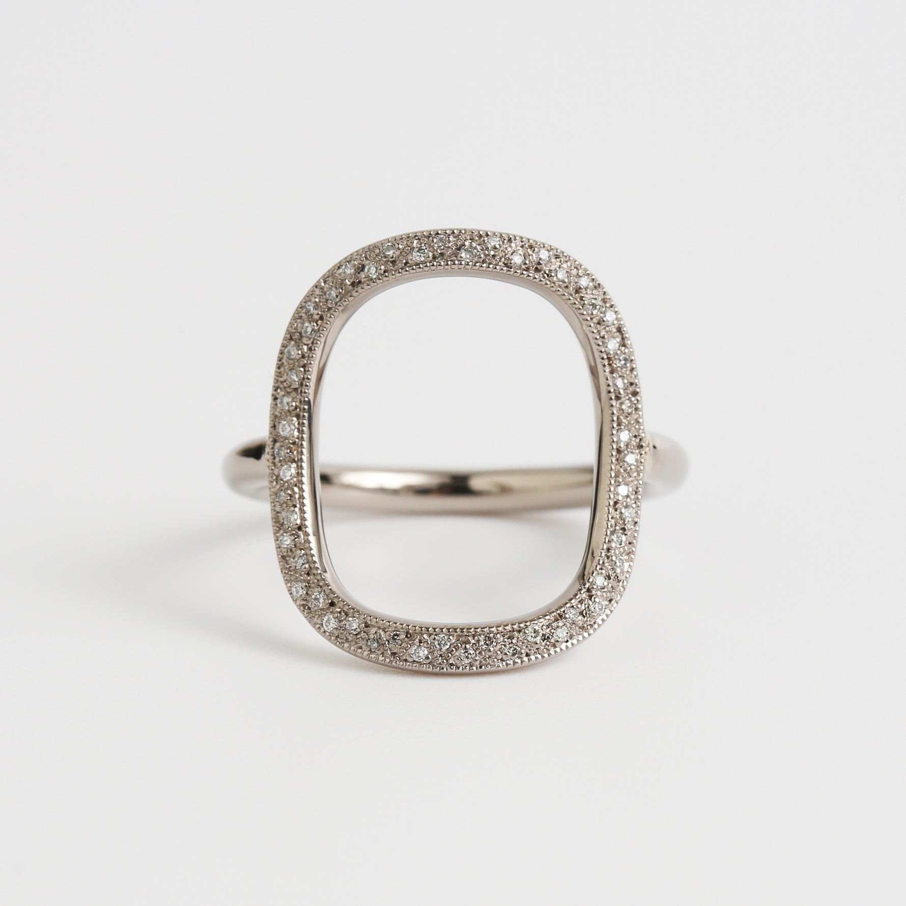 高純度のK18ホワイトゴールドに、パラジウムを多く含む合金を使用し、黄色味を抑えた純粋なホワイトゴールドの美しさを引き出したリングです。大ぶりなデザインに、職人の手による精緻な彫金細工が一周施されており、見る角度によって異なる表情を楽しむことができます。