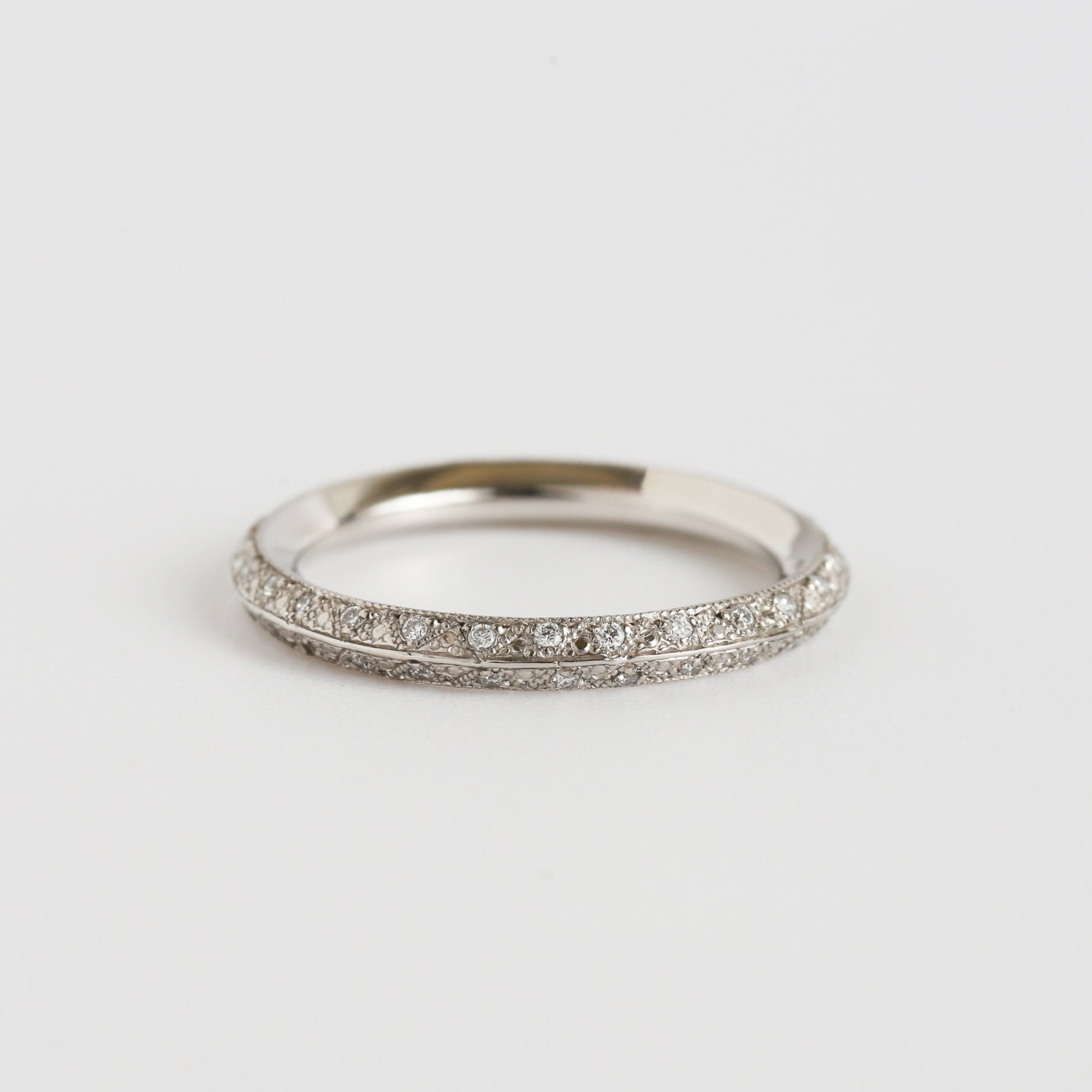 両側面に繊細な彫金技法でダイヤモンドを敷き留めたナイフリッジのように鋭く切り立つフルエタニティリング。華やかな表情ながらシンプルで洗練された佇まい。経年変化を愉しむことのできる上質な輝きと豊かな材質感、使い込んでいくことで完成品へと向かっていきます。ユニセックスでマリッジリングとしてもおすすめ。一粒石やエタニティデザインのエンゲージリングとの重ね付けもしやすいデザインです。
