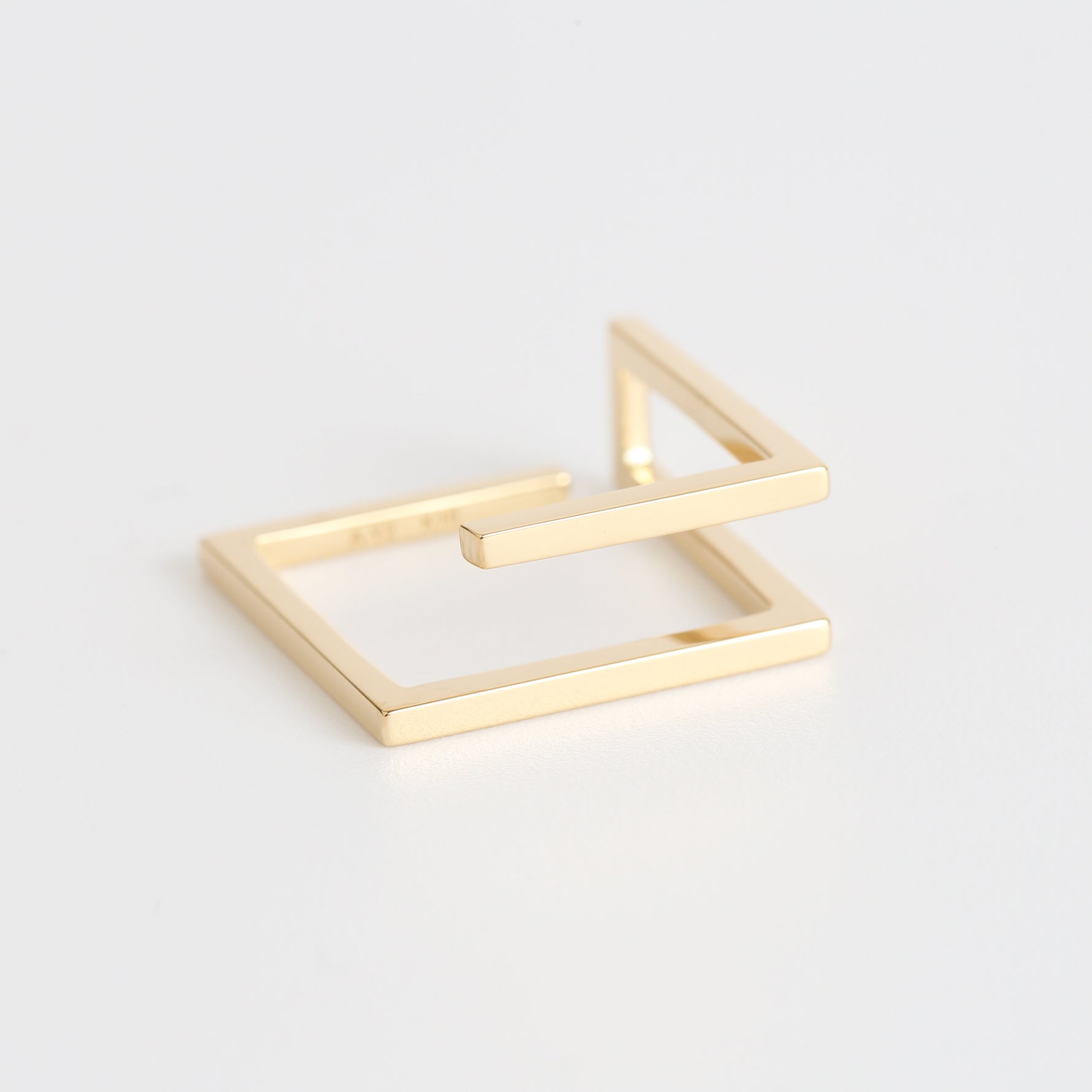 未完成のまま置かれたスクエアリング。K18ゴールドを角状に削り出し四角のフォルムを形成、立体の一部分が開口しており、切り口の方向によって身につけた時の印象が多様化します。モード感を醸し出す存在感のあるこだわりのディテール、指に通した時に完成されるジュエリー。
