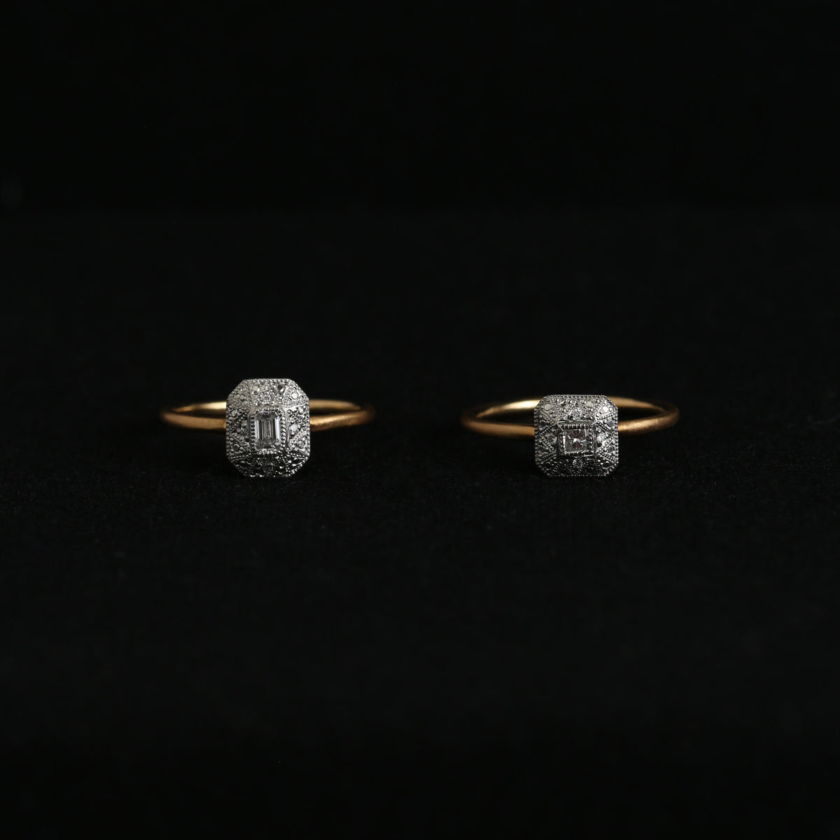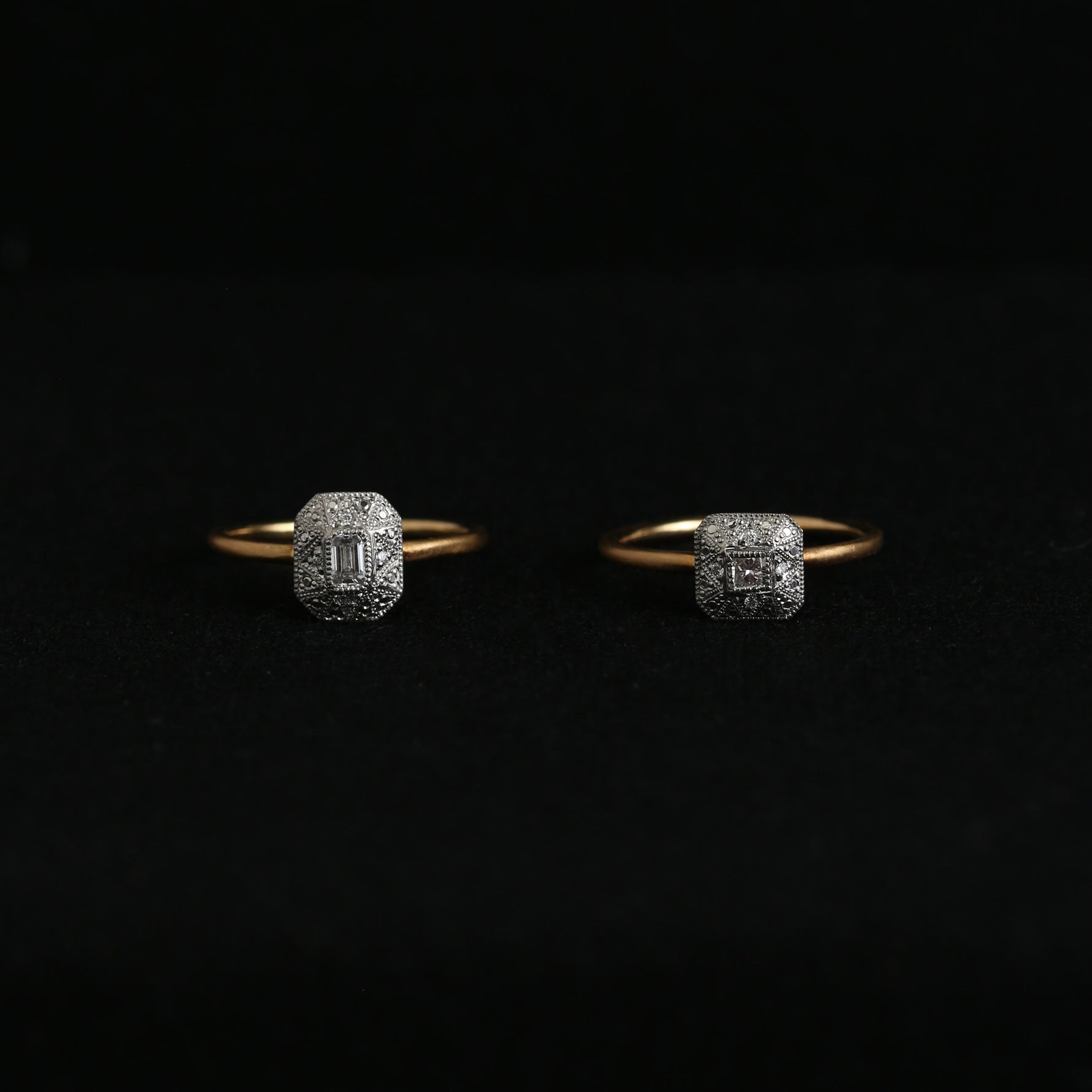 手仕事による繊細な彫金技法でエメラルドカットダイヤモンドの魅力を昇華させたリング。経年変化を愉しむことのできる上質な輝きと豊かな材質感、使い込んでいくことで完成品へと向かっていきます。