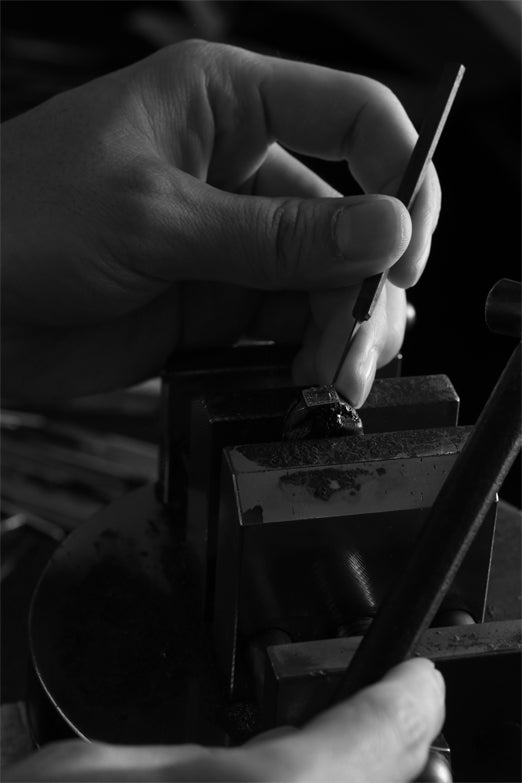30年以上の歴史を持つ工房で、熟練の手仕事が石と金属に命を宿します。