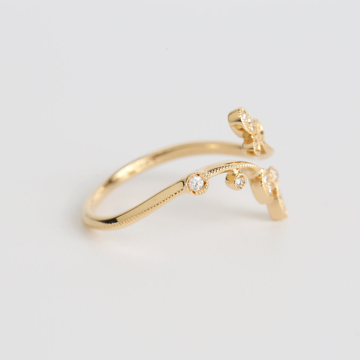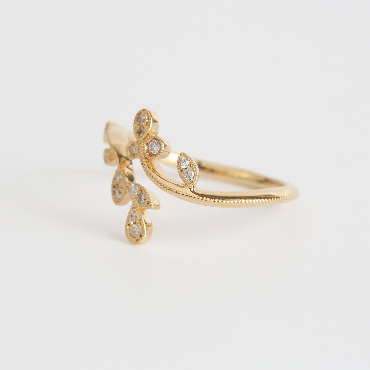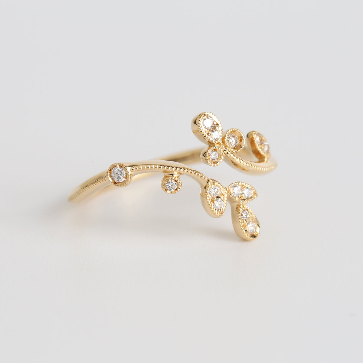 生命力が溢れる植物のリング。躍動的な植物の動きに呼応して小さなダイヤモンドたちが瑞々しく輝くデザイン。アームや葉の部分にミルグレインを細やかに施し、繊細さを表現しています。同シリーズのドレスアップリーフと組み合わせることでより昇華し、まるでひとつの大きな植物のように姿を変えます。